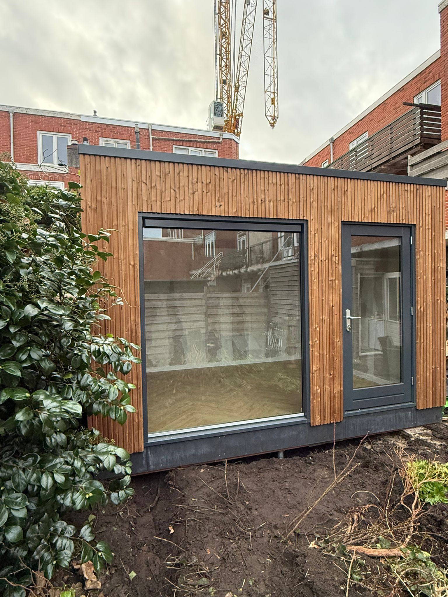 Hierdoor is deze tegen een scherpe prijs van €22.450,- gerealiseerd. Het tuinkantoor werd met een kar vervoerd en met een kraan – over een huizenrij – op zijn plaats gezet. Er hoeft maar één stekker in het stopcontact worden gestoken, en je kunt er direct in werken.